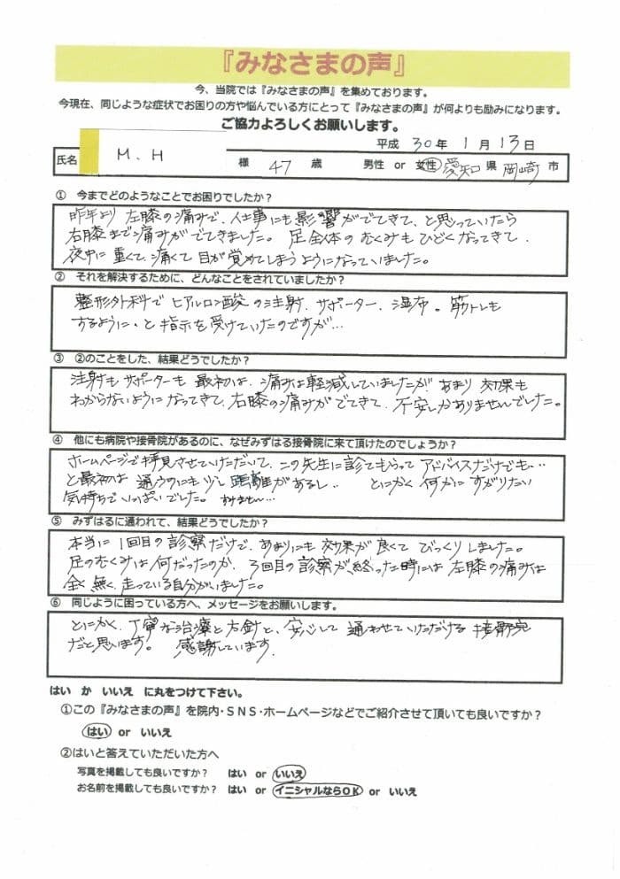 治療後ビックリするほど右膝の痛みや張りが無くなって、すごく感激しました。