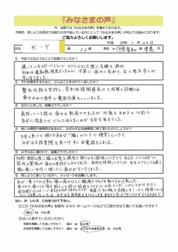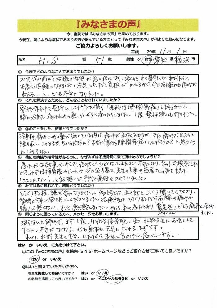 A4 不安と焦りで暇さえあれば「膝」のワードで検索していたら、みずはる整体院を見つけすぐお電話しました。